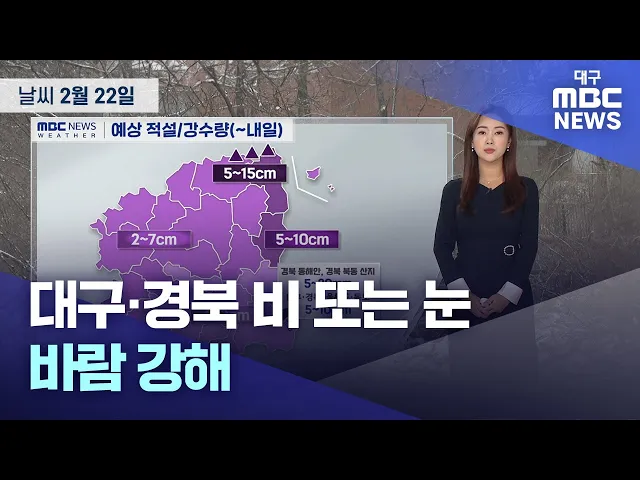 2월 22일 목요일 대구와 경북 지역은 종일 흐린 가운데 곳에 따라 비나 눈이 내렸습니다.포항, 경주에는 강풍주의보가, 경북 북동 산지와 울진, 경주에는 대설주의보가 발효됐습니다.금요일도 흐리겠고 곳에 따라 5~20mm의 비가 오겠습니다.경북 북동 산지와 북부 동해안에는 최대 10~15cm의 많은 눈이 내리는 곳이 있겠습...