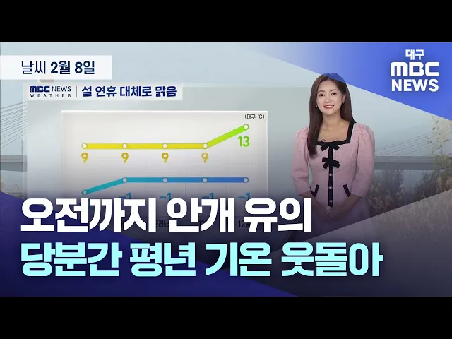 오늘 아침에도 안개가 자욱합니다. 대구와 경북 남부 내륙을 중심으로 안개가 끼어있는데요. 오늘 오전까지 가시거리 200m 내외의 짙은 안개가 끼는 곳도 있어 차간 거리를 넉넉히 두시고 이동하셔야겠습니다. 더불어 밤사이 쌀쌀해지면서 도로 살얼음이나 빙판길이 만들어진 곳도 있으니까요. 보행자 안전에도 유의하시기 ...