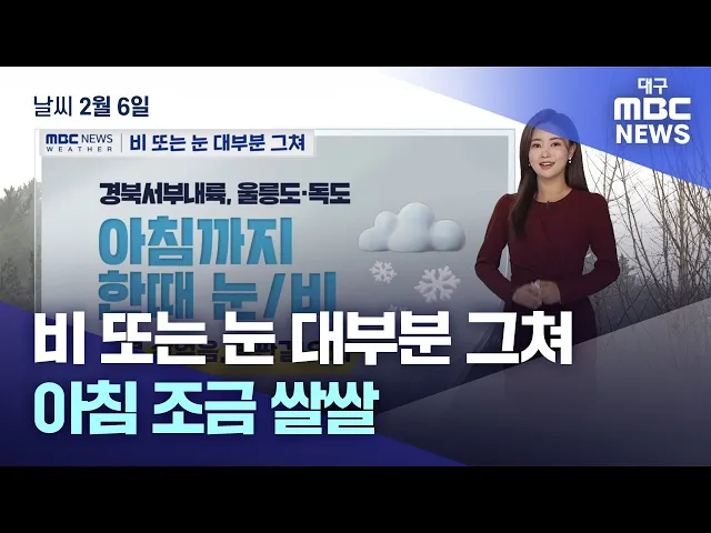 대구와 경북지역은 2월 6일 화요일 대체로 흐린 날씨를 보였습니다.낮 최고기온은 대구 5.3도를 비롯해 포항 4.9 안동 3.2도 등 0도에서 6도의 분포로 전날과 비슷하거나 조금 낮았습니다.화요일 밤과 수요일 새벽 사이에 경북 북부 내륙과 북동 산지에는 1cm 미만의 눈이나 1mm 미만의 약한 비가 오겠습니다.대구와 그 밖...