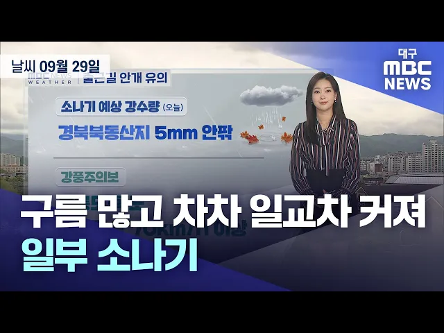 9월 29일 월요일 대구와 경북 지역은 구름 많은 가운데 일교차가 크겠습니다.낮 최고 기온은 대구 26도 등 23~26도의 분포가 예상됩니다.경북 북동 산지에는 늦은 오후 한때 5mm 미만의 소나기가 오겠습니다.화요일은 흐리겠고, 오후부터 저녁 사이 대구와 경북 남부 지역에 5~10mm의 소나기가 오겠습니다.화요일 아침 최저...