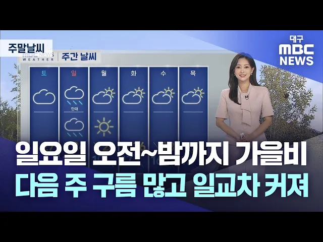 9월 마지막 주 대구·경북 ‘날씨 체크’ 시작합니다.이제 9월도 이틀밖에 남지 않았습니다. 이번 주 날씨가 더 가을로 성큼 다가가겠는데요. 더불어 주 초반에는 소나기가, 금요일은 비가 내릴 전망입니다. 우리 지역 9월 마지막 주 평년 최저 기온 14.7도, 평년 최고 기온 24.5도였습니다.이번 주 월요일은 경북 북동 산지에...