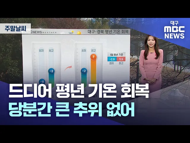 이제 한파의 끝이 보이고 있습니다. 오늘 아침 대구와 경북이 기온 모두 어제보다 조금 올랐는데요. 현재 대구의 기온 -1도, 안동 -8도, 포항 -4도 가리키고 있고요. 여전히 경북 북부 일부에는 한파주의보가 발효 중입니다. 그래도 낮부터는 차차 기온이 올라 대부분 지역에서 8도 안팎 예상되고요. 점차 평년 이맘때 기온...