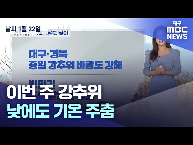 1월 4주 차 대구·경북 '날씨 체크' 시작합니다. 이번 주 손·발 꽁꽁 강추위가 예상됩니다. 월요일부터 기온이 뚝 떨어졌는데요. 영하권 추위는 화요일 절정이 전망되고요. 당분간 낮에도 기온이 크게 오르지 못하겠습니다.우리 지역 평년 최저 기온은 -3.2도, 평년 최고 기온은 5.5도였습니다. 이번 주는 북서쪽에서 찬 공...