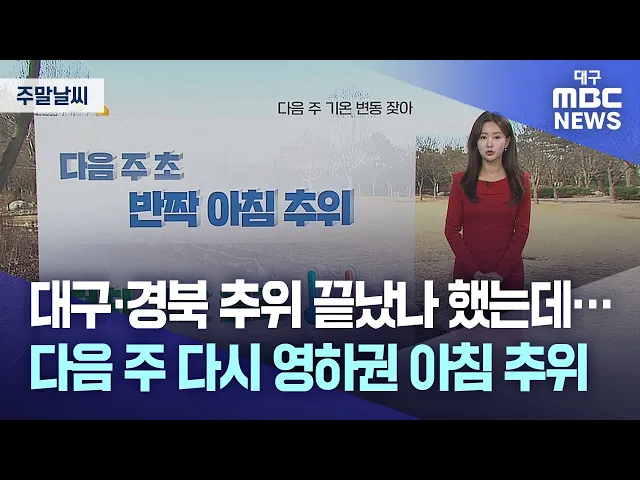변덕이 심했던 기온이 금요일은 평년 수준을 회복했습니다.하지만 토요일 아침에는 다시 추위가 예상되는데요.토요일 대구의 아침 기온 -2도, 안동 -6도, 포항 -1도로 금요일보다 낮겠고요.토요일 오전까지 대구와 경북에는 바람이 강하게 부는 곳도 있겠습니다.그래도 낮 기온은 대구 8도, 안동 6도, 포항 7도로 평년 수준...