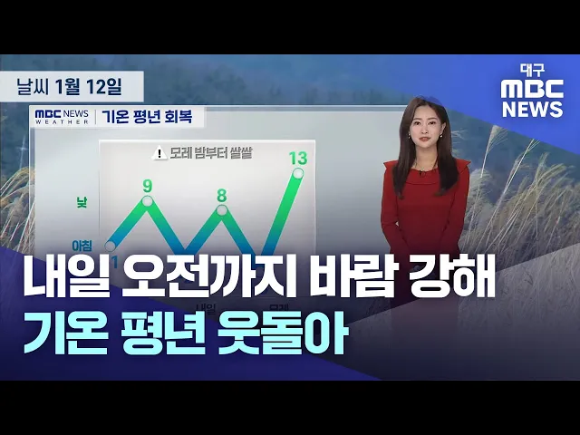 1월 12일 금요일 대구와 경북 지역은 대체로 맑은 가운데 큰 추위는 없겠습니다.낮 최고 기온은 대구 9도, 안동 7도, 포항 10도 등 4도에서 10도의 분포를 보이겠습니다.금요일 오전까지 순간풍속 55km 안팎의 강풍이 부는 곳이 있겠습니다.토요일은 대체로 맑겠고 아침 최저 기온은 영하 8도에서 영하 1도, 낮 최고 기온은...