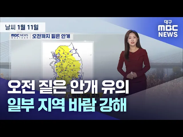 1월 11일 목요일 대구와 경북 지역은 대체로 맑다가 늦은 오후부터 구름이 많아지겠습니다.낮 최고 기온은 대구와 포항 8도, 안동 5도 등 4도에서 10도로 평년보다 2~3도가량 높겠습니다.오전까지 대구와 경북 내륙을 중심으로 가시거리 200m 미만의 짙은 안개가 끼는 곳이 있겠습니다.미세먼지는 '나쁨' 수준을 보이겠습니...