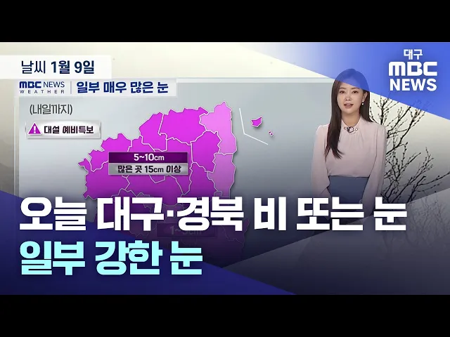 1월 9일 화요일 대구와 경북 지역에는 오후부터 많은 양의 눈이나 비가 내리겠습니다.수요일까지 예상 적설량은 경북 북부 내륙과 남서 내륙, 북동 산지와 대구 군위 5~10cm, 군위를 제외한 대구와 경북 중남부 내륙, 동해안에는 1~5cm입니다.많은 곳은 15cm 넘는 눈이 쌓이겠습니다.비가 내리면 예상 강수량은 경북 동해안...