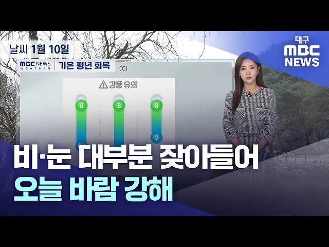 1월 10일 수요일 대구와 경북 지역은 구름이 많은 가운데 저녁까지 경북 남부 동해안에 비가 오는 곳이 있겠습니다.포항과 경주에는 강풍주의보가 발효 중입니다.수요일 밤부터 목요일 오전까지 대구와 경북 내륙에 가시거리 200m 미만의 짙은 안개가 끼겠습니다.목요일은 대체로 맑다가 늦은 오후부터 구름이 많아지겠고 ...