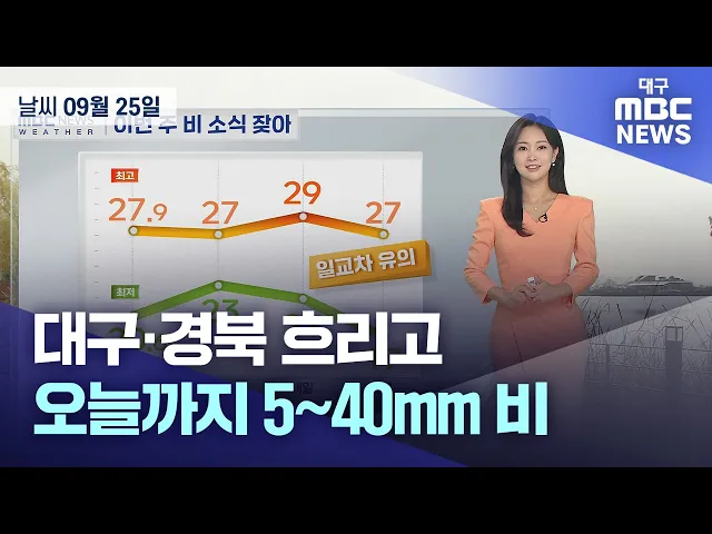 9월 25일 목요일 대구와 경북 지역은 대체로 흐린 가운데 가끔 비가 내리는 곳이 있겠습니다.예상 강수량은 5~20mm입니다. 낮 최고 기온은 대구와 구미 27도, 청도 28도 등 25도에서 28도를 보이겠습니다. 미세먼지와 초미세먼지 농도는 '좋음' 수준이 예보됐습니다. 금요일은 가끔 구름이 많겠고, 일교차가 크겠습니다. 아...