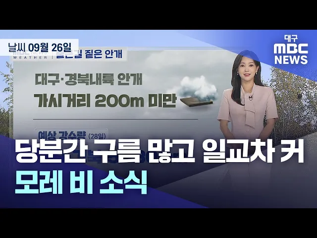 대구와 경북 지역은 가끔 구름이 많은 가운데 내륙을 중심으로 아침까지 짙은 안개가 끼는 곳이 많겠습니다.9월 26일 금요일 아침 최저 기온은 대구 19.8도, 안동 17.7도, 포항 20.8도 등입니다.낮 최고 기온은 대구 29도, 경산 31도 등 26~31도까지 오르며 무덥겠습니다.토요일도 가끔 구름 많겠고 밤부터 차차 흐려져 일...