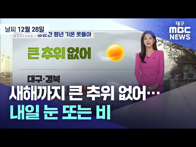 12월의 마지막 금요일 날씨입니다.새해를 맞이하는 다음 주까지 당분간 큰 추위 없겠는데요.기온도 평년 수준을 웃돌며 야외활동하실 때는 낮과 밤의 기온 차만 신경 잘 쓰시면 되겠습니다.다만 추위가 약해지며 미세먼지 농도가 짙어졌습니다.오늘 대구와 경북의 미세먼지와 초미세먼지 농도 모두 ‘나쁨’으로 공기 질이 탁...