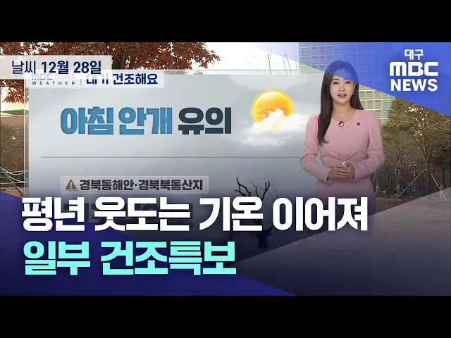 12월 28일 목요일 대구와 경북 지역은 대체로 맑은 가운데 포근한 날씨가 이어지겠습니다.낮 최고 기온은 대구 10도, 안동 8도, 포항 11도 등 6도에서 11도의 분포를 보이겠습니다.금요일은 대체로 맑다가 밤부터 흐려지는 가운데 아침 기온 영하 7도에서 0도, 낮 기온은 6도에서 12도로 예상합니다.대구기상청은 "건조특보...