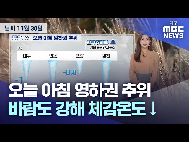 11월의 마지막 날 매서운 추위가 찾아왔습니다.오늘 아침 대구의 기온 -1도 안동 -4도, 포항 -0.8도로 대구와 경북 대부분 지역에서 영하권으로 출발하는데요.기온이 낮은 경북북동산지와 봉화에는 '한파주의보'도 발효 중입니다.오늘 우리 지역 낮 기온도 대부분 5도 내외 예상되고요.어제보다 낮은 기온에 바람까지 강하...