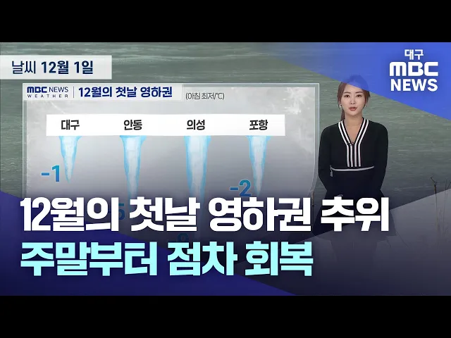 12월 첫날인 금요일 대구와 경북은 대체로 맑은 가운데 영하권의 강추위가 이어지겠습니다.아침 최저 기온은 대구 영하 1.6도, 안동 영하 5.8, 포항 영하 2.4도를 기록했습니다.낮 최고 기온은 대구 4도 등 2도에서 7도에 머물겠고 바람도 강하게 불어 춥겠습니다.경북 북동 산지와 봉화 평지에는 한파주의보가 내려졌고, ...