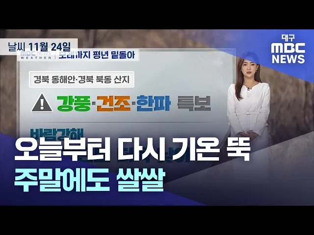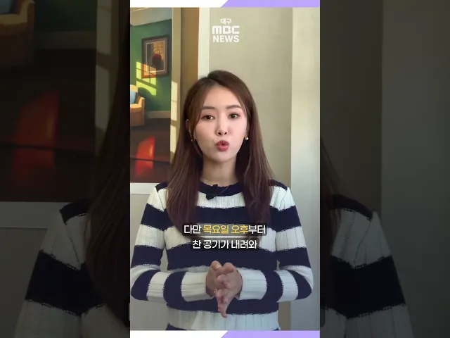 오늘 아침 따뜻하게 입고 나가셔야겠습니다.어제는 낮 기온이 21.6도까지 올라 포근했는데요.오늘 아침 대구의 기온은 4도로 대부분 지역에서 기온이 15도 이상 큰 폭으로 떨어졌습니다. 낮 기온도 6도에 머물며 기온 주춤하겠고요.내일은 -3도까지 내려가 더 쌀쌀해지겠습니다.이번 주 주말 내내 영하권의 추위가 이어지겠...