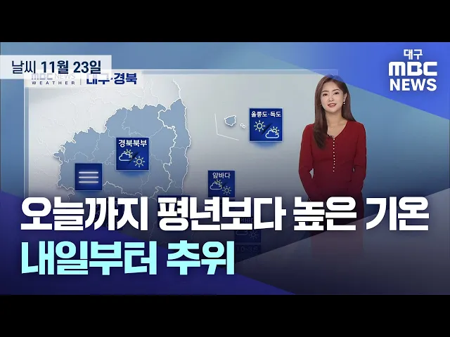 대구와 경북 지역은 흐리다 차차 구름이 많겠고 일교차가 매우 크겠습니다. 11월 23일 목요일 아침 최저 기온은 대구 6.8도, 안동 4.5도, 포항 11.5도 등이었습니다.낮 최고 기온은 대구 19도 등 14~21도의 분포를 보이며 포근하겠습니다.경북 북동 산지에는 건조주의보와 강풍주의보가 발효 중입니다.밤부터 금요일 아침 ...