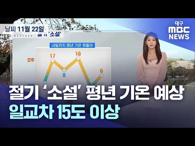 오늘은 첫눈이 내리는 절기 '소설'인데요.눈 소식 없이 온화한 날씨가 예상됩니다.현재 대구의 기온은 2도 가리키고 있고요.낮에는 20도 안팎까지 기온 오르겠습니다.오늘 대부분 지역에서 낮과 밤의 기온 차가 15도 이상으로 매우 크게 벌어지겠고요.내일 오후부터 찬 공기가 내려와 모레 아침 기온은 내일보다 10도 이상 ...