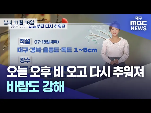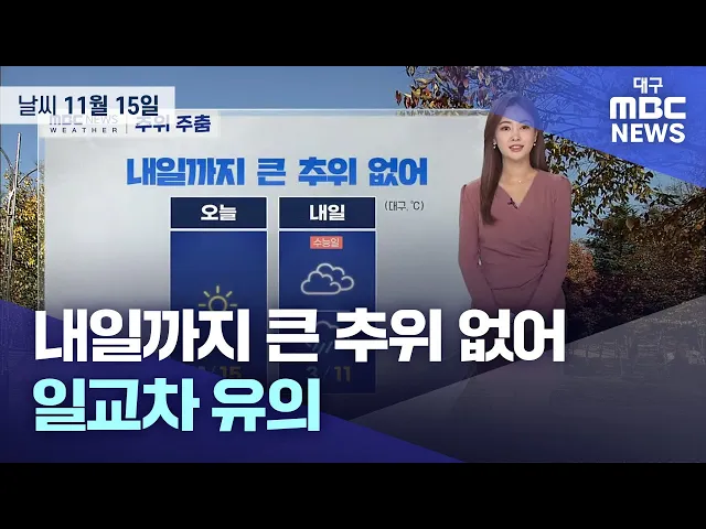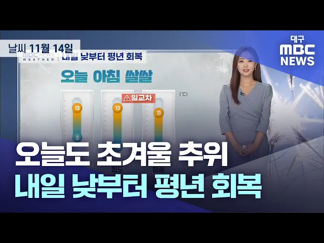 쌀쌀한 날씨가 이어졌는데 오늘은 평년 이맘때 기온을 회복하겠습니다.오늘 아침에는 어제와 비슷하게 시작하는데요.낮에는 대구와 경북 대부분 지역에서 15도까지 기온이 오르겠습니다. 수능일인 내일도 큰 추위는 없겠습니다.우리 지역 내일 아침 기온 평년과 비슷하거나 조금 높겠고요.다만 내일 비가 내린 뒤 다시 찬 ...