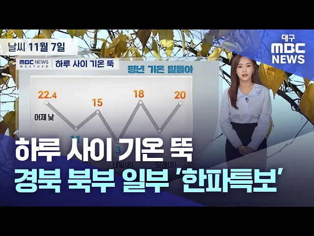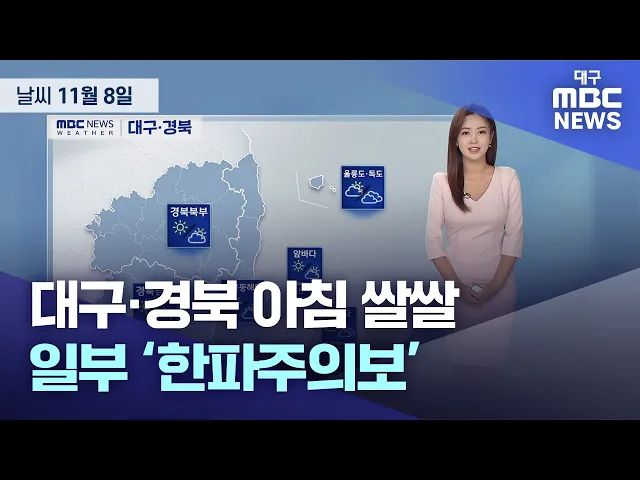 11월 7일 화요일 대구·경북 지역은 기온이 뚝 떨어지며 종일 쌀쌀했습니다.영천, 군위, 성주, 김천 등 경북 8개 시군에는 한파주의보가 내려져 있습니다.'입동'인 수요일은 아침 최저 기온이 대구 3도 등 영하 3도에서 영상 7도로 기온이 더 떨어지겠고 경북 내륙을 중심으로 서리가 내리거나 얼음이 어는 곳이 있겠습니다....