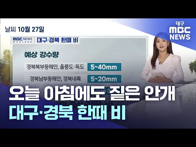 금요일인 10월 27일 대구·경북 지역은 대체로 흐린 가운데 오전까지 짙은 안개가 끼는 곳이 많겠습니다.경북 동해안과 내륙에는 아침부터 낮까지 5에서 최대 40mm, 대구에는 낮 한때 5mm 미만의 비가 오는 곳이 있겠습니다.비는 돌풍과 천둥·번개를 동반하겠고 우박이 떨어지는 곳도 있겠습니다.금요일 아침 최저 기온은 대...