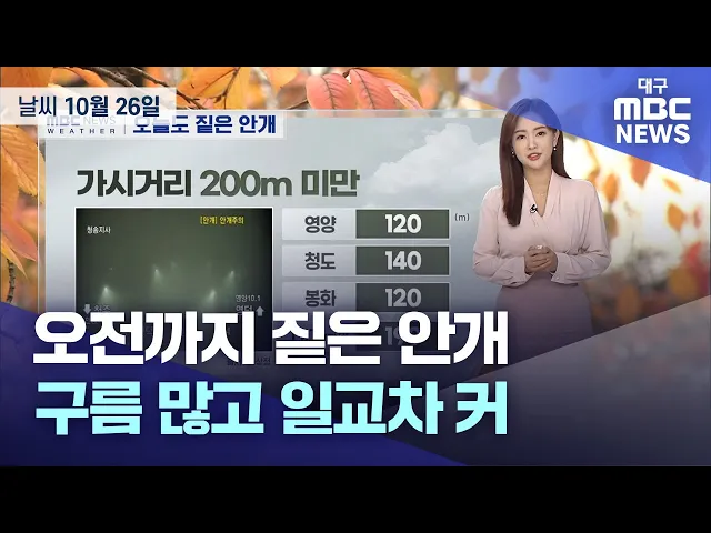 10월 26일 목요일 대구와 경북 지역은 가끔 구름이 많은 가운데 오전까지 내륙을 중심으로 짙은 안개가 끼는 곳이 많겠습니다.아침 최저 기온은 대구 9.8도, 안동 8.8도, 포항 14도 등이었습니다.낮 최고 기온은 대구 24도 등 20~25도의 분포로 전날과 비슷하겠습니다.미세먼지와 초미세먼지 농도는 '보통' 수준을 보이겠습...