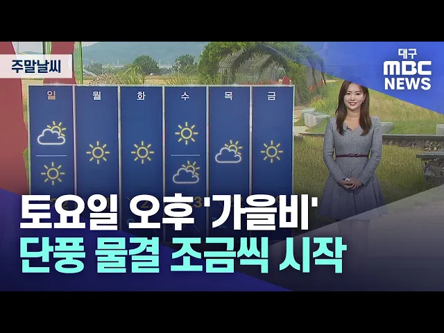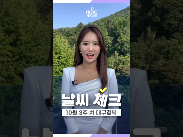 10월 3주 차 대구·경북 '날씨 체크' 시작합니다.벌써 10월이 반이나 지났습니다. 날씨가 부쩍 더 선선해졌죠? 이번 주 대체로 맑은 날씨 이어지다 금요일 오전에 비가 내리겠고요. 비가 그치고 주말부터 쌀쌀한 날씨가 이어질 전망입니다.우리 지역 평년 최저 기온은 10.6도, 평년 최고 기온은 21.5도였습니다. 이번 주 평...