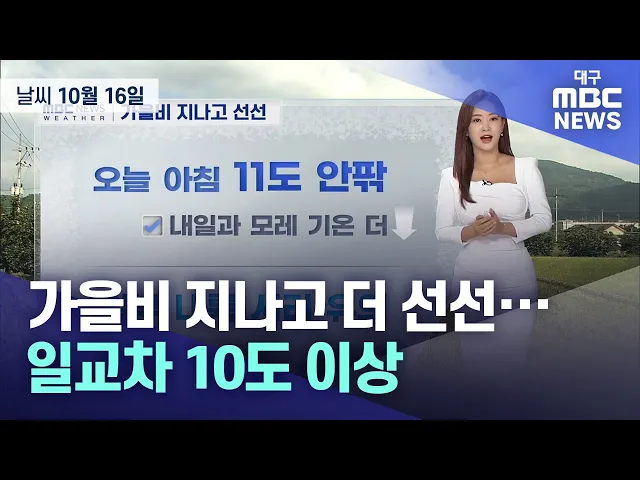 10월 16일 월요일 대구와 경북 지역은 대체로 맑고 일교차가 크겠습니다.경북 북부 동해안에는 오후에 5mm 안팎 비가 오는 곳이 있겠습니다.월요일 아침 최저 기온은 대구 10.9도, 안동 8.8도, 포항 14.7도를 기록했습니다.낮 최고 기온은 대구 21도 등 19도에서 22도로 일요일과 비슷하겠습니다.바람이 불어 체감온도는 더...