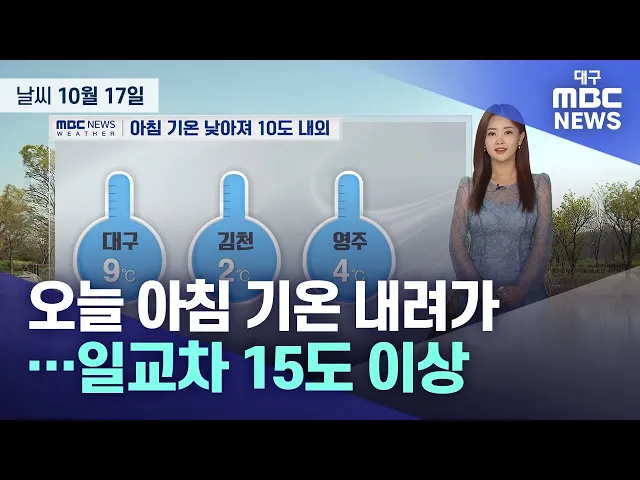 10월 17일 화요일 대구와 경북 지역은 대체로 맑고 낮과 밤의 기온 차가 크겠습니다.아침 최저 기온은 대구 9.7도, 구미 7도, 영천 6.3도까지 떨어졌습니다.낮 최고 기온은 대구와 경산 22도, 청도 23도 등 20도에서 23도의 분포를 보이겠습니다.바람이 불어 체감온도는 더 낮겠습니다.대구지방기상청은 수요일까지 내륙에 ...