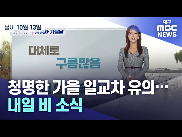 대구와 경북 지역은 밤부터 차차 구름이 많겠고 일교차가 매우 크겠습니다.목요일인 10월 12일 낮 최고 기온은 대구 23.8도, 성주 24.6도, 안동 22.8도 등이었습니다.경북 동해안에는 너울에 의한 높은 물결이 갯바위나 방파제를 넘는 곳도 있겠습니다.북부 내륙에는 밤사이 기온이 크게 떨어지며 서리가 내리는 곳이 있겠...