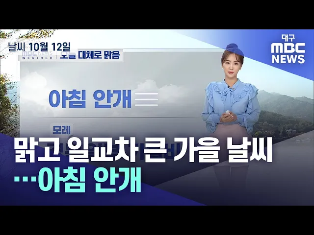오늘도 맑고 청명한 가을 날씨가 펼쳐집니다.다만 밤사이 떨어진 기온에 안개가 낀 곳이 많은데요.오늘 아침까지 대구와 경북내륙에는 가시거리 200m 미만의 짙은 안개가 끼어 있어 안전운전 하시기 바랍니다.한편 모레는 경북 일부 지역을 중심으로 한 때 비가 내리겠습니다.이번 비는 돌풍과 함께 천둥, 번개를 동반해 요...