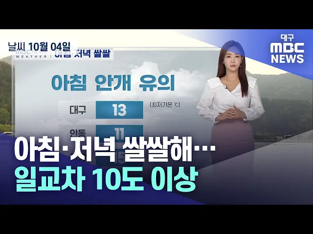 풍성한 추석 연휴 보내셨나요? 이제는 아침, 저녁으로 제법 쌀쌀해졌습니다.오늘 아침 안개가 짙게 끼어있는 곳이 많은데요.현재 기온 보시면 대구 13도, 안동 11도, 포항 15도 가리키고 있고요.일부 경북내륙을 중심으로는 아침 기온이 10도 이하로 내려가 있습니다.내일부터 북서쪽에서 찬 공기가 내려와 모레 아침 기온...