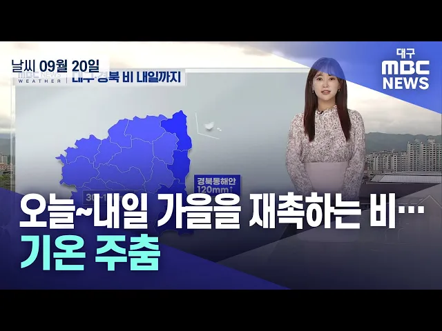 수요일인 9월 20일 대구와 경북 지역은 비가 내리면서 종일 선선하겠습니다.목요일까지 대구와 경북에 30~100mm, 경북 동해안에는 120mm 이상의 많은 비가 쏟아지겠습니다.낮 기온은 대구와 구미 25도, 경산 26도 등 21도에서 26도로 전날보다 5도가량 낮겠습니다.목요일도 비가 오는 가운데 아침 최저 기온은 18도에서 21...