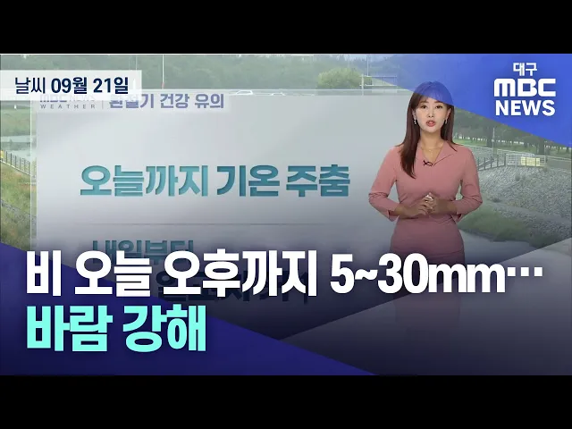 화요일인 9월 19일 대구와 경북 지역은 가끔 구름 많은 가운데 늦더위가 이어졌습니다.낮 최고 기온은 청도 30.1도, 대구 29.5도, 구미 28.9도를 기록했습니다.수요일은 대체로 흐리겠고, 아침에 경북 북부 내륙부터 비가 시작돼 오후에는 대구와 경북 대부분 지역에 비가 내리겠습니다.목요일까지 예상 강수량은 대구와 경...