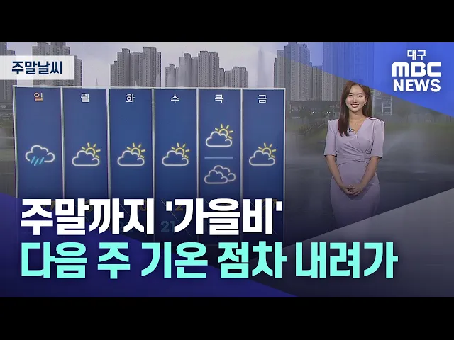 금요일인 9월 15일 대구와 경북 지역은 흐린 가운데 비가 그쳤다 내리기를 반복하고 있습니다.비는 주말 내내 이어지겠습니다.일요일까지 예상 강수량은 대구와 경북 30~80mm, 경북 북부는 100mm 이상입니다.토요일 아침 최저 기온은 대구 22도 등 19도에서 23도, 낮 최고 기온은 대구 29도 등 25도에서 30도의 분포를 보이...