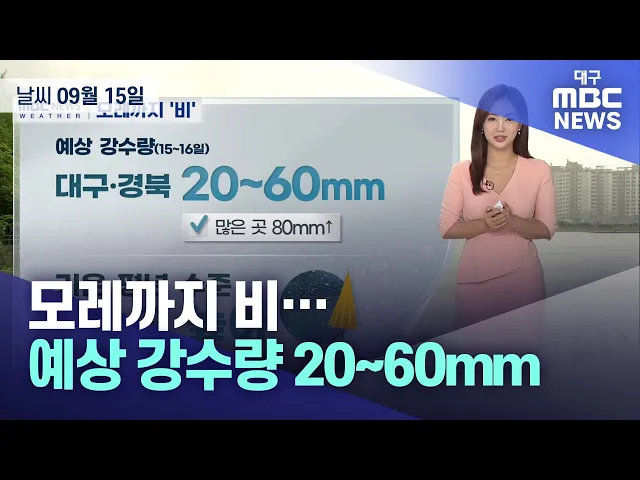 대구와 경북지역은 밤사이 비가 소강상태를 보였다가 9월 16일 토요일 오전부터 다시 내리고 있습니다. 대구와 청도 등 경북 남부지역과 상주, 문경 등 경북 북서 내륙지역에 비가 내리고 있고, 소강상태를 보이는 경북 다른 지역도 오후부터 비가 내리겠습니다. 일요일까지 예상 강수량은 30~80mm이며 경북 북부지역에는 ...