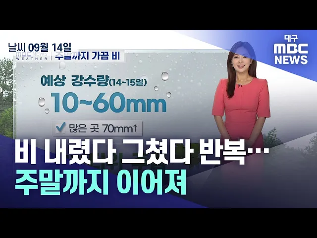 9월 14일 목요일 대구와 경북 지역은 종일 흐리고 비가 내렸다 그치기를 반복하겠습니다.예상 강수량은 금요일까지 10~60mm이고 경북 북부 내륙에는 최대 70mm 이상 비가 오는 곳도 있겠습니다.목요일 아침 최저 기온은 대구 21.4도, 안동 20.2도, 포항 21.6도 등이었습니다.낮 최고 기온은 대구 25도 등 24~26도에 머물겠...