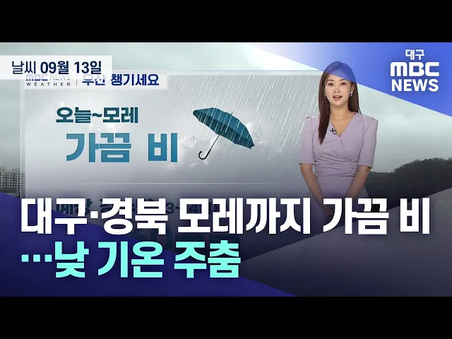 수요일인 9월 13일 대구와 경북 지역에는 비가 내리면서 더위가 한풀 꺾였습니다.낮 최고 기온은 대구 28.4도, 구미 26.4도, 상주 24.6도 등을 보였습니다.목요일은 비가 내렸다 그치기를 반복하겠습니다. 목요일까지 예상 강수량은 대구와 경북 10~60mm, 경북 북부 내륙 70mm 이상입니다.목요일 아침 최저 기온은 대구 21...