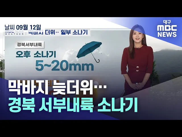 요즘 아침, 저녁으로 시원한 가을 날씨 만끽하기 좋습니다.다만 기온 차가 커지며 대기가 불안정한 일부 지역에는 소나기 구름이 만들어졌는데요. 오늘과 내일 경북 서부내륙에는 5~20mm의 소나기가 내리겠고요. 오늘 내륙을 중심으로 막바지 더위가 기승을 부리겠습니다. 대구와 경북 대부분 지역의 낮 기온 30도 안팎 예...