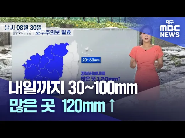 8월 30일 수요일 대구와 경북 지역은 종일 강하고 많은 비가 내리겠습니다.현재 대구를 비롯해 경북 대부분 내륙에 호우주의보가 발효 중입니다. 전날부터 내린 비의 양은 예천 118mm, 의성군 단북 112mm, 영주시 부석 114.5mm, 고령 95.5mm, 대구 달성군 65mm 등입니다. 특히 수요일 밤까지 곳에 따라 시간당 30~60mm의 강...