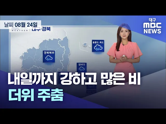 목요일인 8월 24일 대구와 경북 지역은 종일 흐리고 많은 비가 내리겠습니다.현재 포항과 경주에 호우주의보, 상주와 문경에는 호우예비특보가 내려졌습니다.예상 강수량은 금요일 아침까지 50~120mm입니다.경북 동해안과 북부 내륙을 중심으로 돌풍과 천둥·번개를 동반한 시간당 30~60mm의 강한 비가 쏟아지겠고 그 외 내...