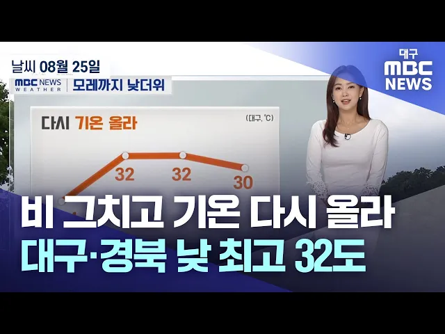 대구와 경북 지역은 대체로 흐린 가운데 무더운 날씨가 이어지고 있습니다.대구와 경산에는 폭염주의보가 발효 중입니다. 금요일인 8월 25일 낮 최고 기온은 대구 32.1도, 경산 33도, 경주 33.3도 등이었습니다.토요일은 가끔 구름이 많겠고 무더위도 계속되겠습니다.토요일 아침 최저 기온은 대구 22도 등 17~23도, 낮 최...
