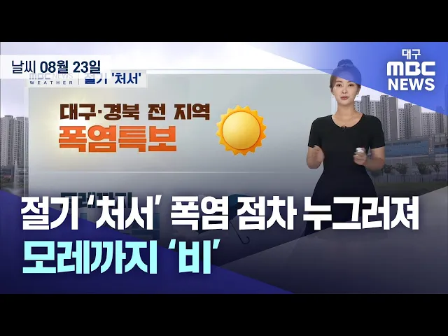 오늘은 무더운 여름이 지나고 더위가 그친다는 절기 '처서'입니다.다만 대구와 경북 전 지역에는 여전히 폭염특보가 발효 중이고요. 오늘도 낮에는 대부분 지역에서 기온이 최고 34도까지 오르겠습니다. 그래도 오늘은 2주 가까이 이어지던 폭염을 누그러트려 줄 비 소식이 있습니다. 우리 지역에는 오늘부터 모레 아침 사...