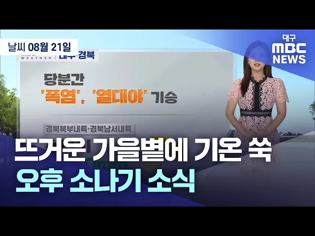 8월 21일 월요일 대구와 경북은 가끔 구름이 많이 끼겠고 오후부터 저녁 사이 경북 내륙을 중심으로 소나기가 오겠습니다.예상 강수량은 5~40mm입니다. 돌풍과 천둥·번개를 동반한 시간당 20~30mm의 매우 강한 소나기가 내리는 곳이 있겠습니다.대구 경북 전 지역에 폭염특보가 내린 가운데 낮 최고 기온은 대구 34도, 안동...