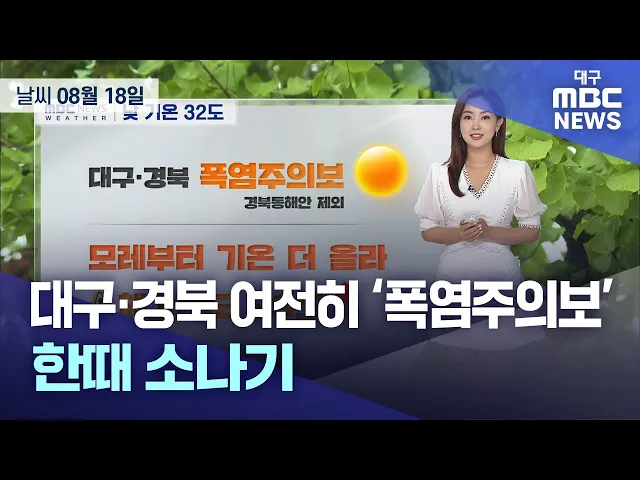 금요일인 8월 18일 대구·경북은 대체로 흐린 가운데 동해안을 중심으로 강한 비가 내리는 곳이 있겠습니다.토요일 오전까지 경북 남부 동해안에 최대 100mm 이상, 대구와 경북에 10~60mm의 비가 오겠습니다.대구와 경북 18개 시군에는 폭염주의보가 발효 중입니다.금요일 낮 최고 기온은 대구 31도, 구미와 성주 32도 등 27...
