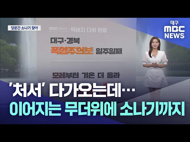 이번 주는 폭염에 소나기까지 잦았던 한주였습니다.대구와 경북내륙을 중심으로 일주일째 '폭염주의보'가 이어지고 있는데요. 특히 낮에는 자외선 지수도 매우 강해 햇볕이 따갑게 느껴졌습니다. 다음 주 절기 '처서'를 앞두고 막바지 더위가 기승을 부리겠습니다. 일요일(20일)부터는 기온이 다시 올라 낮에는 최고 33도까...
