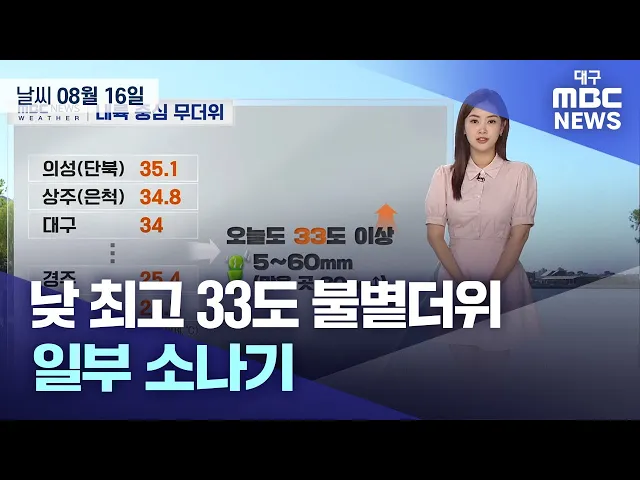 8월 16일 대구·경북 지역은 무더운 가운데 오후부터 저녁 사이 천둥과 번개를 동반한 소나기가 오는 곳이 있겠습니다.적게는 5mm, 많게는 80mm 이상 쏟아지겠습니다. 동해안을 제외한 대구와 경북 대부분 지역에는 폭염주의보가 내려져 있습니다.16일 낮 최고 기온은 대구와 구미 32도, 고령 31도 등 27도에서 33도의 분포...