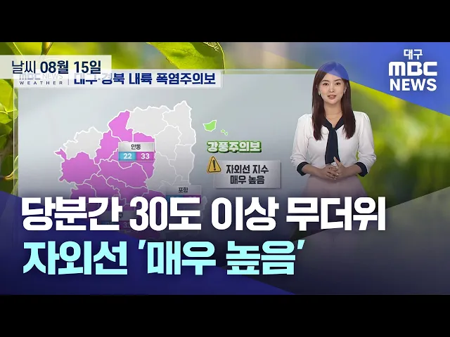 오늘은 제78주년 광복절입니다. 오늘도 대구와 경북은 낮 기온이 33도까지 올라 푹푹 찌는 듯한 더위가 이어지겠습니다. 한편 동풍의 영향을 받는 경북 동해안에는 오늘 오전까지 빗방울이 떨어지는 곳 있겠습니다. 내일까지 순간풍속 15m/s 이상으로 바람도 강하게 불겠습니다. 다시 시작된 폭염에 몸과 마음이 지치기 쉬...