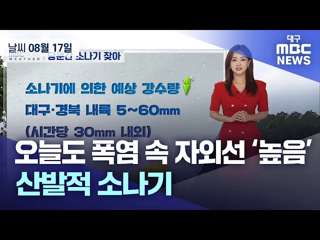 8월 17일 대구와 경북 지역은 대체로 흐린 가운데 낮부터 저녁 사이 소나기가 오는 곳이 있겠습니다.예상 강수량은 5~60mm입니다. 시간당 30mm 안팎의 강한 소나기가 내리는 곳도 있겠습니다.동해안을 제외한 대구와 경북 대부분 지역에는 폭염주의보가 내려져 있습니다.17일 낮 최고 기온은 대구와 안동 31도, 포항 28도 ...