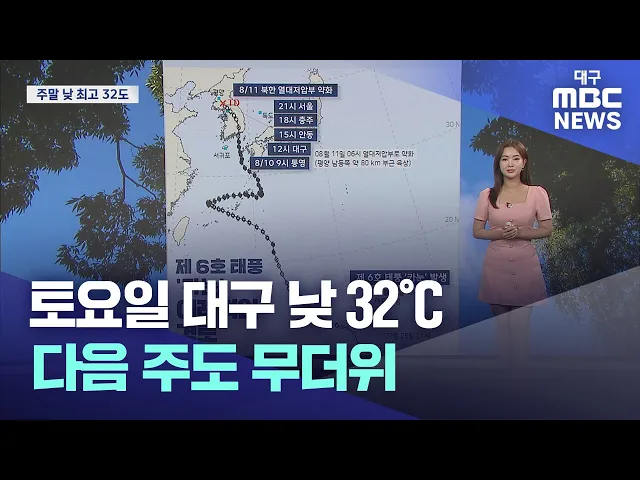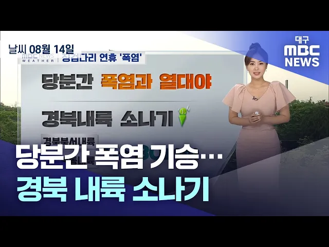 이번 주는 계속 불볕더위가 예상돼 온열질환 대비 잘하셔야겠습니다.당분간 낮에는 체감온도가 33도 이상 오르겠고요. 뜨거운 열기를 머금고 밤에도 열대야가 예상됩니다. 한편 오늘 경북 동부에는 아침까지 가끔 비가 지나겠고요. 늦은 오후부터 저녁 사이에는 경북내륙을 중심으로 5~30mm의 소나기가 예상됩니다.태풍이 ...
