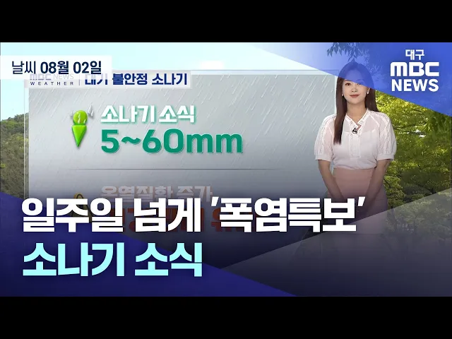 대구와 경북 전역에 일주일 넘게 폭염경보가 발효 중인 가운데 8월 2일은 가끔 구름이 많겠고 내륙을 중심으로 오후 한때 소나기가 쏟아지겠습니다.예상 강수량은 5~60mm이고, 돌풍이 불고 천둥·번개가 치는 곳이 있겠습니다.수요일 아침 최저 기온은 대구 23.9도, 안동 24.1도, 포항 25.4도 등을 기록했습니다.낮 최고 기...